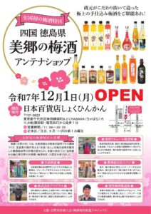 令和7年12月1日より日本百貨店しょくひんかんにおいて「徳島県美郷梅酒アンテナショップ」を開設いたします。